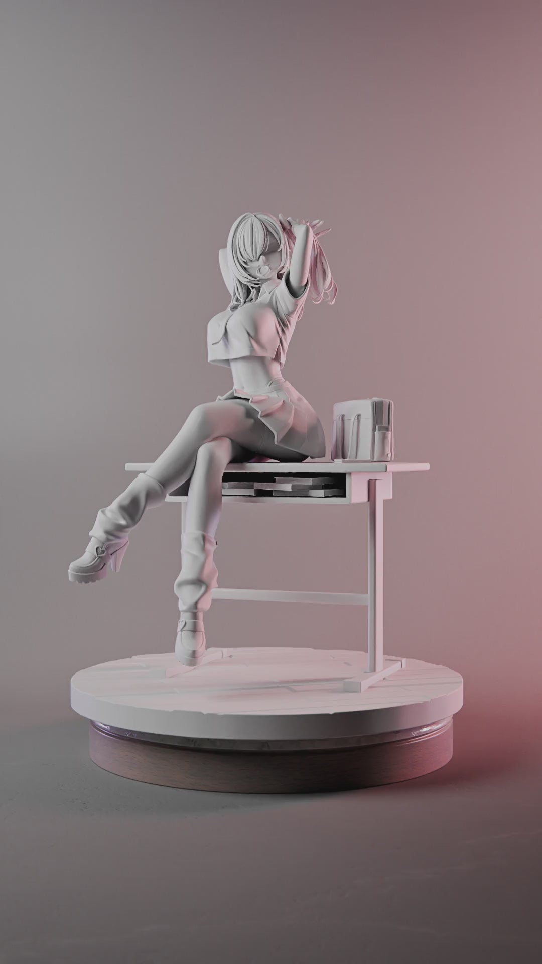 This stunning sculpture captures Naga in a relaxed, confident moment as she sits casually on a school desk with one leg elegantly crossed over the other. Her playful posture exudes cool sophistication - the perfect embodiment of a student who's equally comfortable with technology and style. The pose suggests a break between classes or a casual study session, making the scene instantly relatable and charming.
